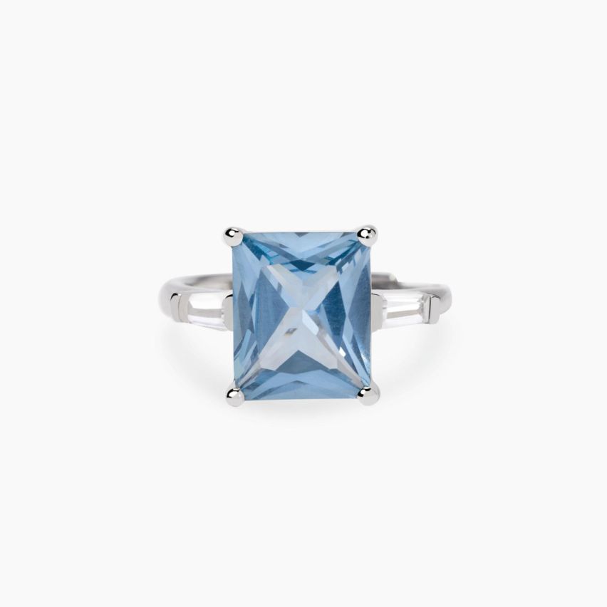 Protagonista assoluta è l’acquamarina sintetica taglio baguette da 9 x 11 mm, caratterizzata da linee pulite e da un colore delicato e luminoso, capace di donare freschezza ed eleganza ad ogni gesto.
